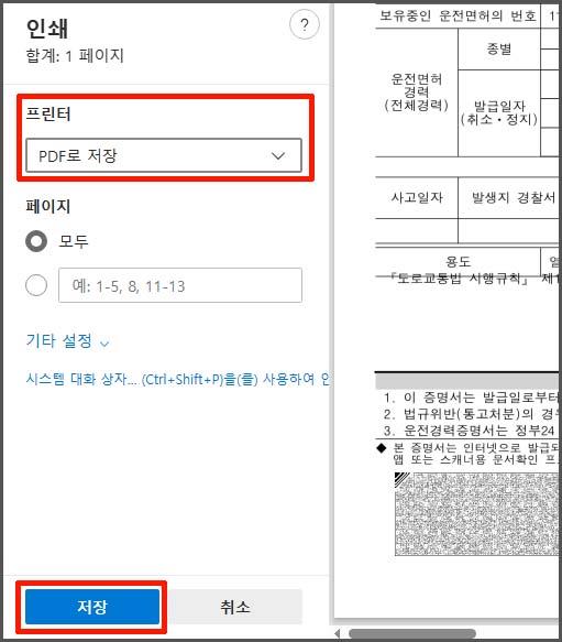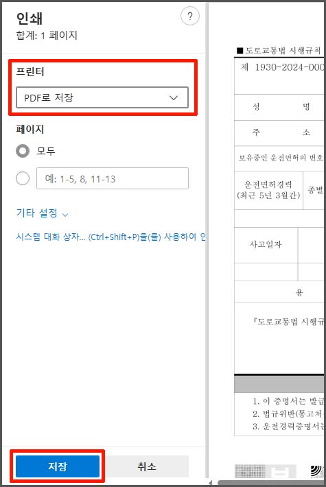 12. 만약 PC에 프린터가 연결되어 있지 않다면 프린터 항목에서 PDF로 저장을 선택하고 저장 버튼을 누르면 PDF 파일로 저장된 프린터가 있는 곳에서 출력하거나 PDF 파일을 보낼 수 있습니다.