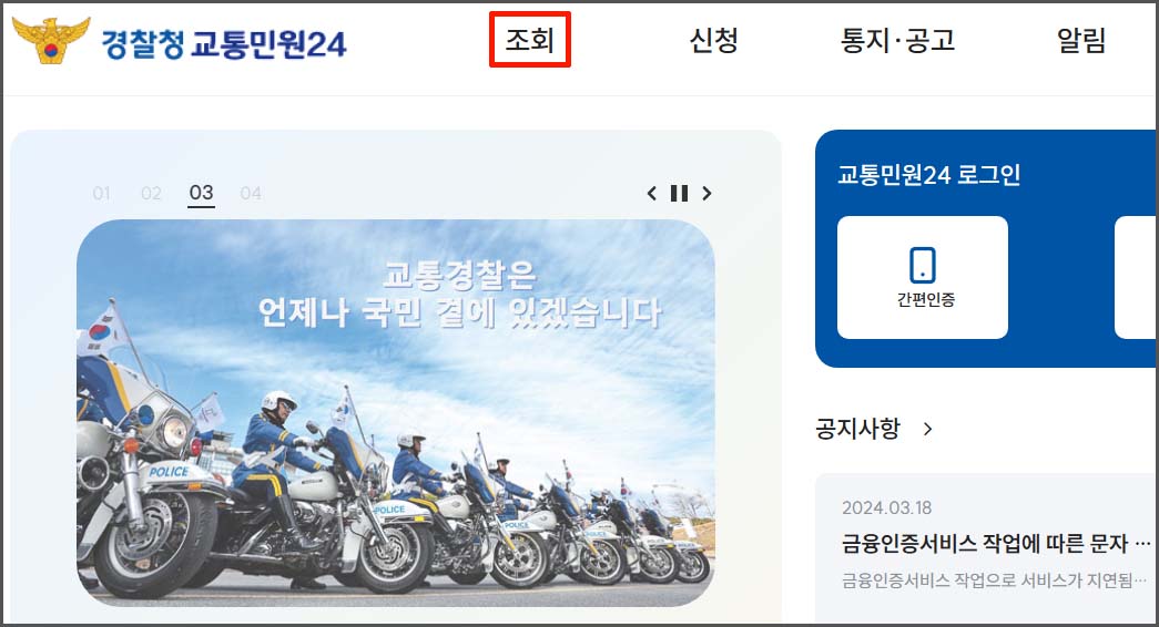 2. 경찰청 교통 민원 24 홈페이지 상단 메뉴에서 조회를 선택해 주세요.