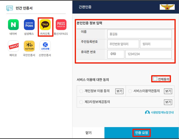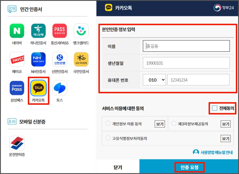 5. 민간 인증서에서 카카오톡을 선택합니다. 이름, 주민등록번호, 휴대폰 번호 입력, 전체동의 체크 후 인증 요청 버튼을 클릭해 주세요.