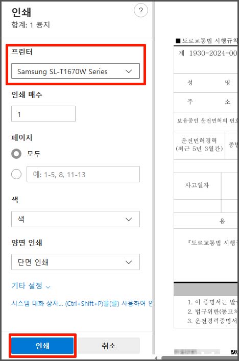 10. 운전경력증명서를 인쇄하려면 사용할 수 있는 프린터 선택 후 인쇄 버튼을 눌러주세요.