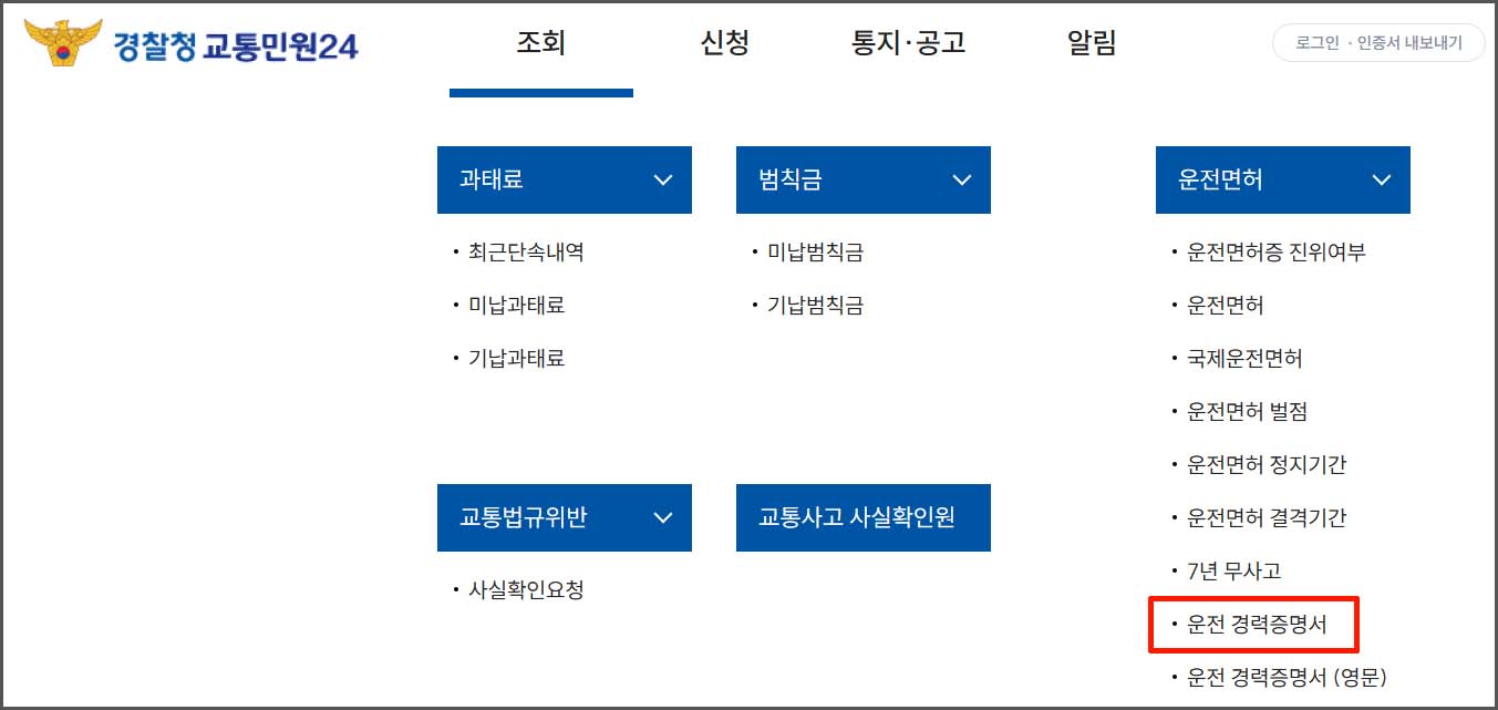 7. 다시 경찰청 교통 민원 24 홈페이지 상단 메뉴 조회 > 운전경력증명서를 선택합니다.