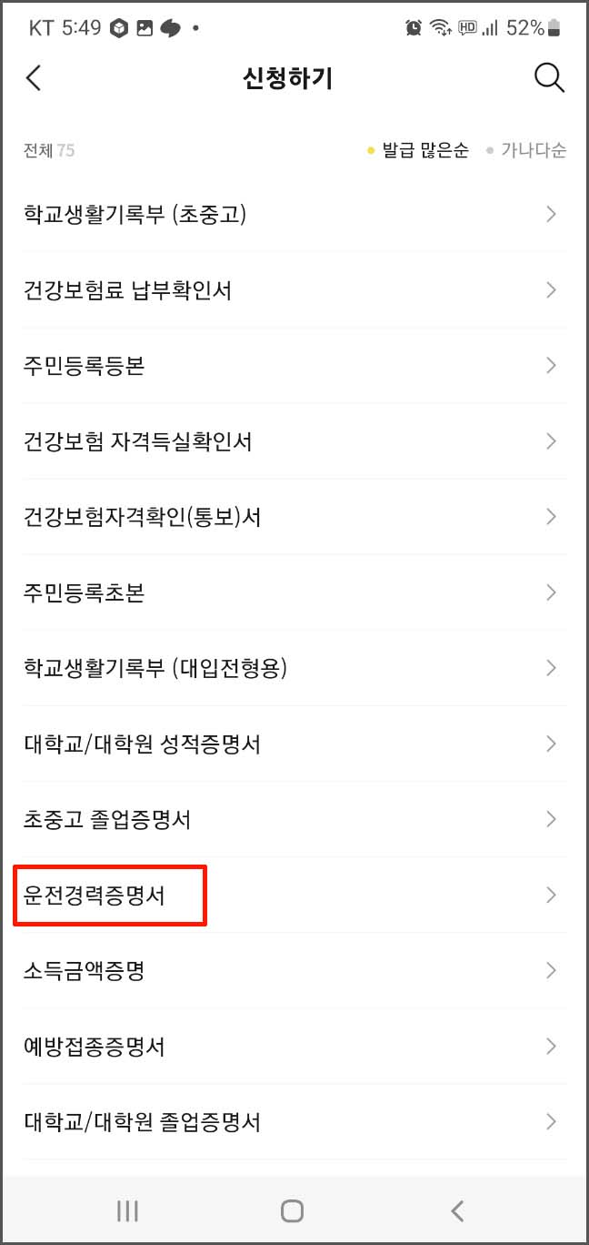3. 운전면허 항목에서 운전경력증명서를 선택합니다.