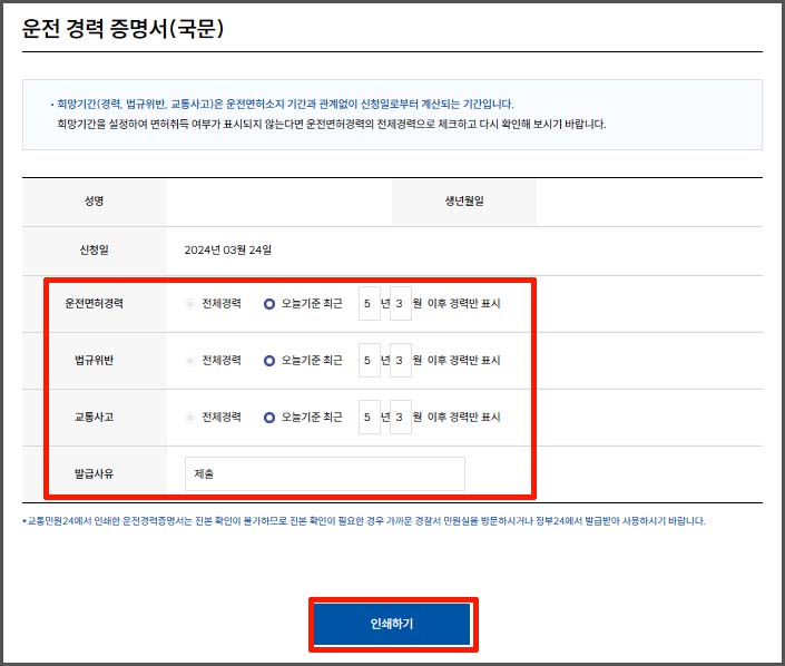 8. 성명과 생년월일, 신청일은 자동으로 입력되어 있고 운전면허 경력, 법규 위반, 교통사고 항목에 전체경력 또는 오늘 기준으로 필요한 날짜를 입력 후 발급 사유를 꼭 입력해야 합니다. 아래 인쇄하기 버튼을 눌러주세요.