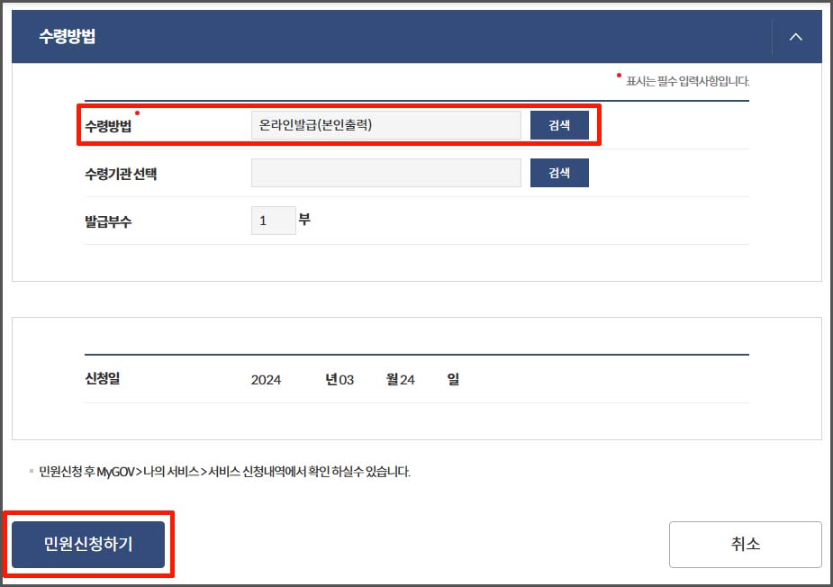 - 온라인 발급(본인 출력) : 모바일에서는 민원 문서 출력이 제한되어 PC 정부 24 홈페이지에 접속해 신청 내역에서 출력할 수 있습니다.