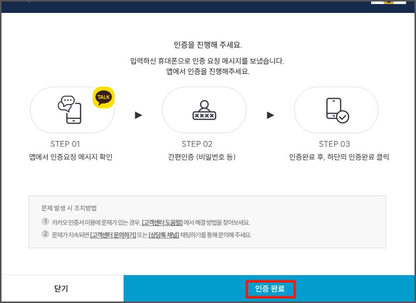 7. 카카오톡 인증 요청 메시지 확인 후 인증 완료 버튼을 클릭해 주세요.