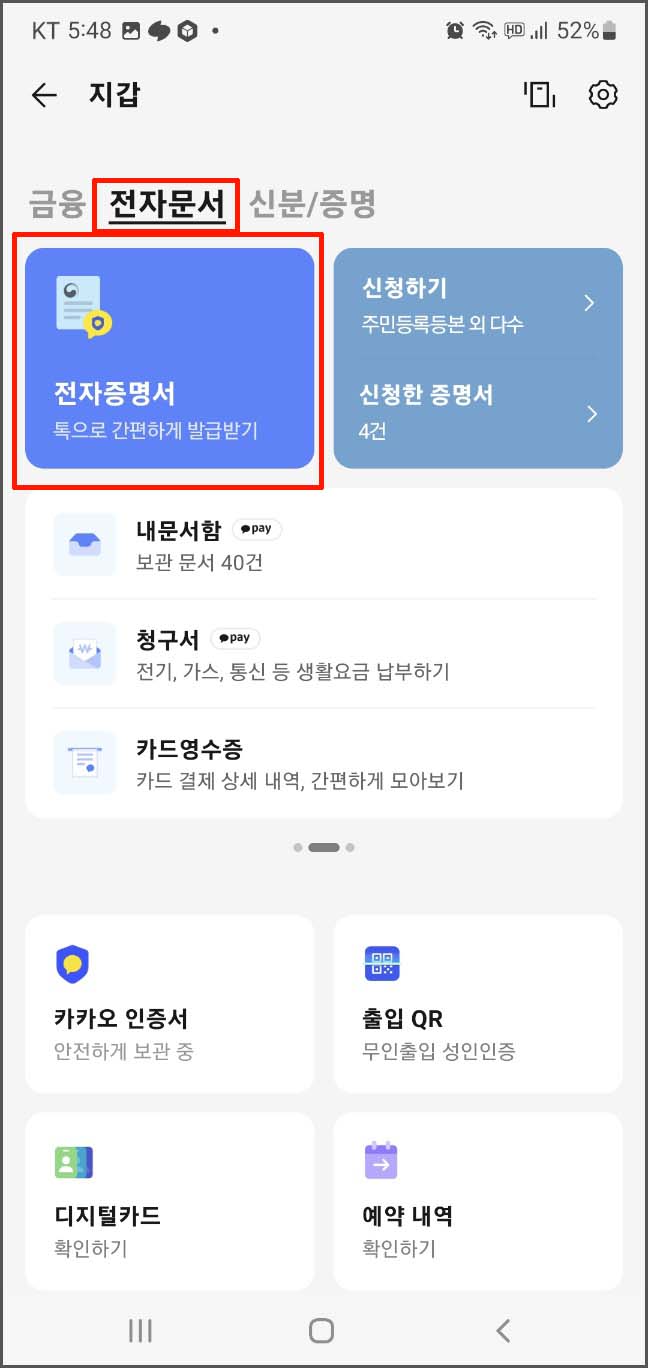 4. 전자문서 항목에서 전자증명서를 선택합니다.