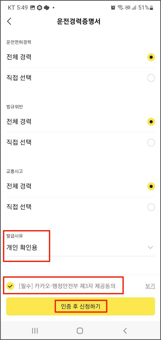 7. 운전면허 경력, 법규 위반, 교통사고 항목은 전체 경력 또는 직접 입력을 선택하고 발급 사유는 개인 확인용, 기관 제출용, 회사 제출용, 기타 경력 증명용 중 하나를 선택합니다. 필수동의 체크, 인증 후 신청하기 버튼을 클릭해 주세요.