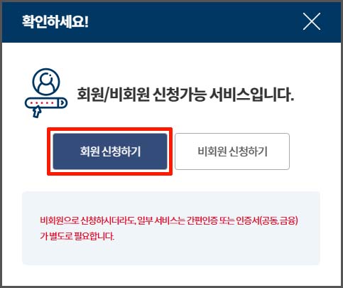 4. 회원/비회원 신청하기 선택 창이 나오면 회원 신청하기를 클릭해 주세요. 정부 24 홈페이지에서는 주민등록등본, 소득금액증명원 등 자주 사용하는 민원 서비스가 있어 회원가입 후 이용하는 걸 추천합니다.
