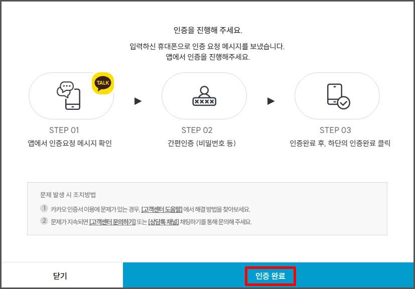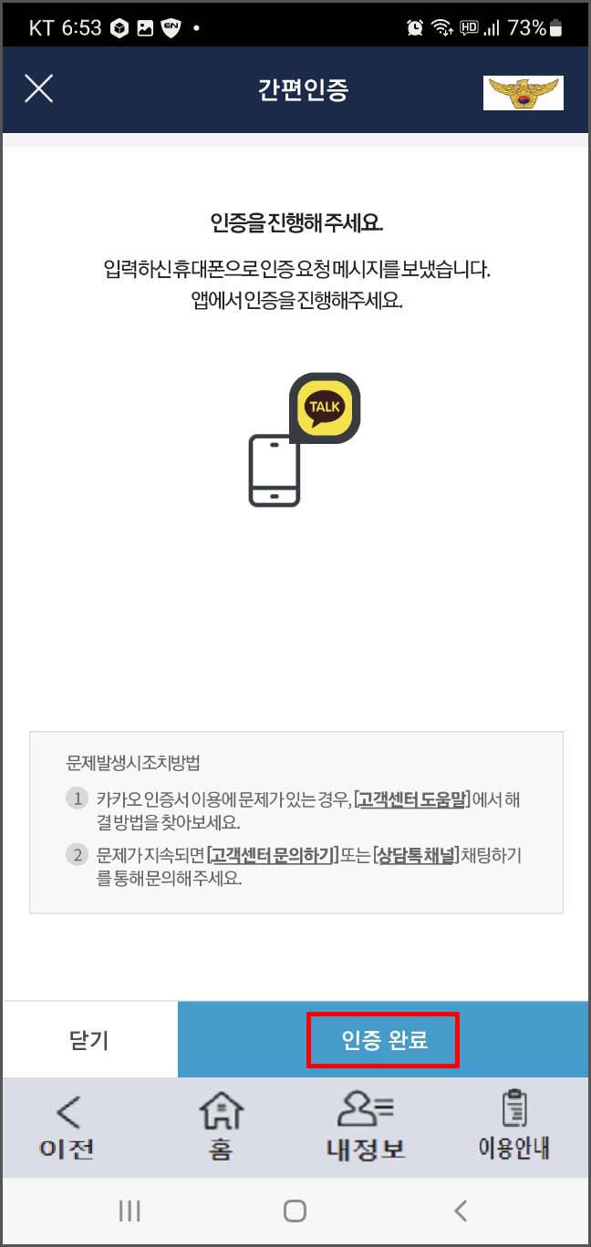 7. 카카오톡에서 인증 메시지 확인 후 인증 완료 버튼을 클릭합니다.