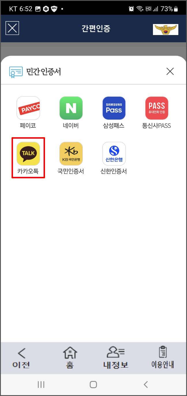 4. 민간인증서 항목에서 카카오톡 아이콘을 선택합니다.