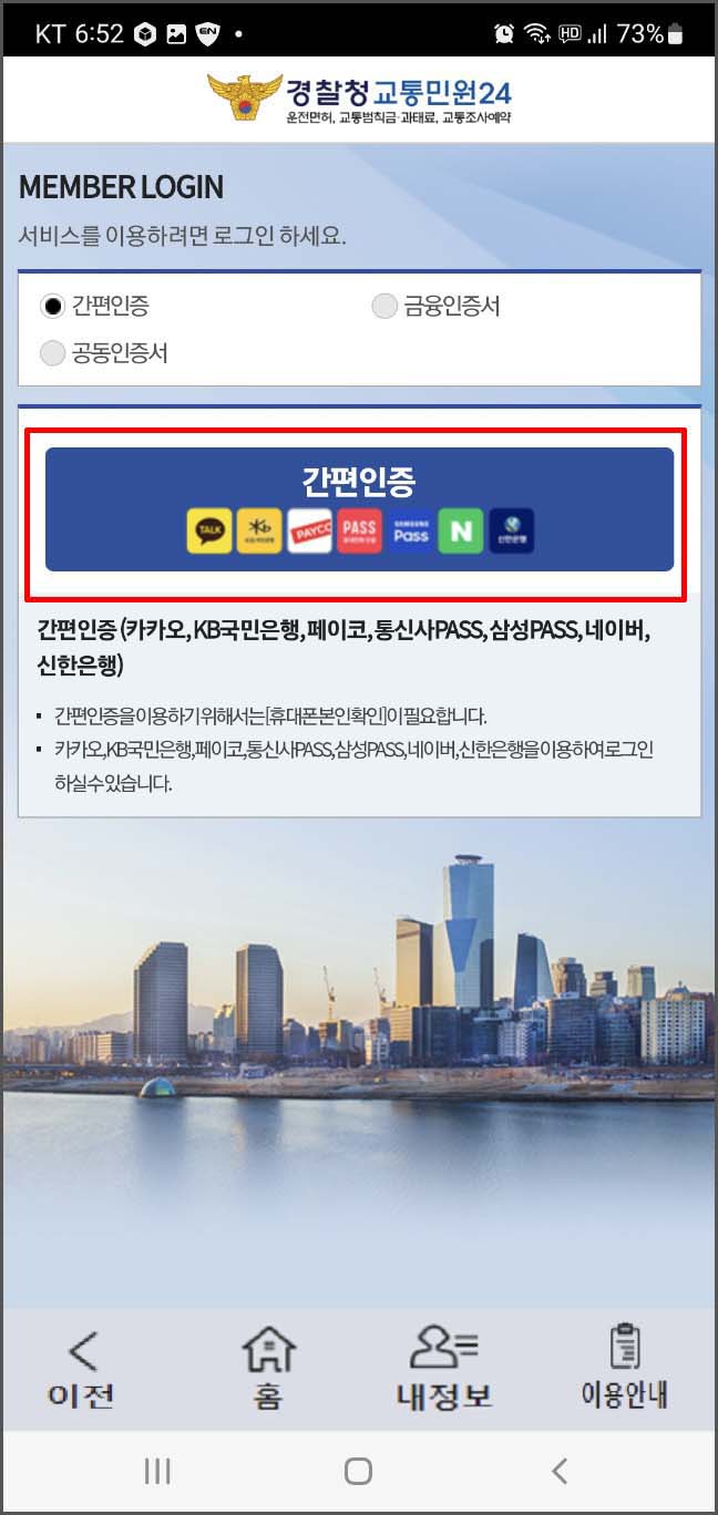 5. 최근 단속 내역을 조회하려면 로그인해야 하는데요 간편 인증, 금융인증서, 공동인증서 중 가장 편한 것으로 인증하면 됩니다. 저는 간편 인증 카카오톡으로 인증하겠습니다.
