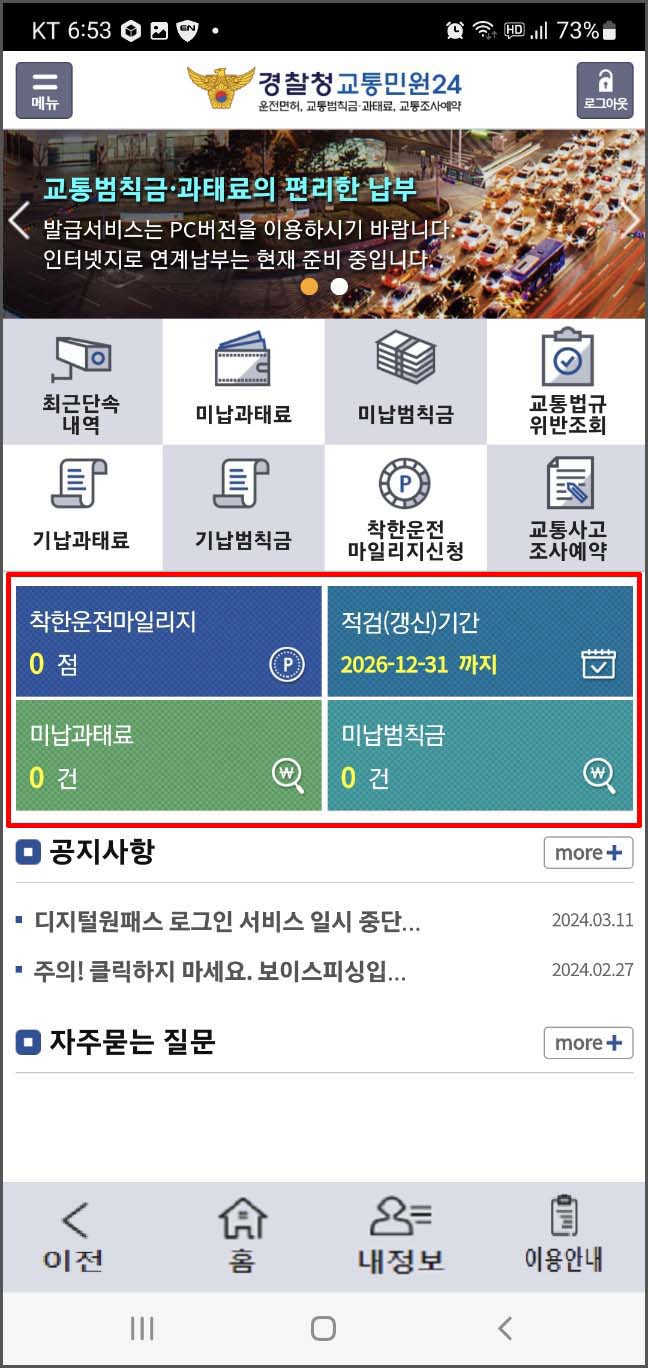 7. 인증이 완료되면 착한 운전 마일리지, 적성검사(갱신) 기간, 미납과태료, 미납범칙금을 한 번에 확인할 수 있게 화면에 표시됩니다.