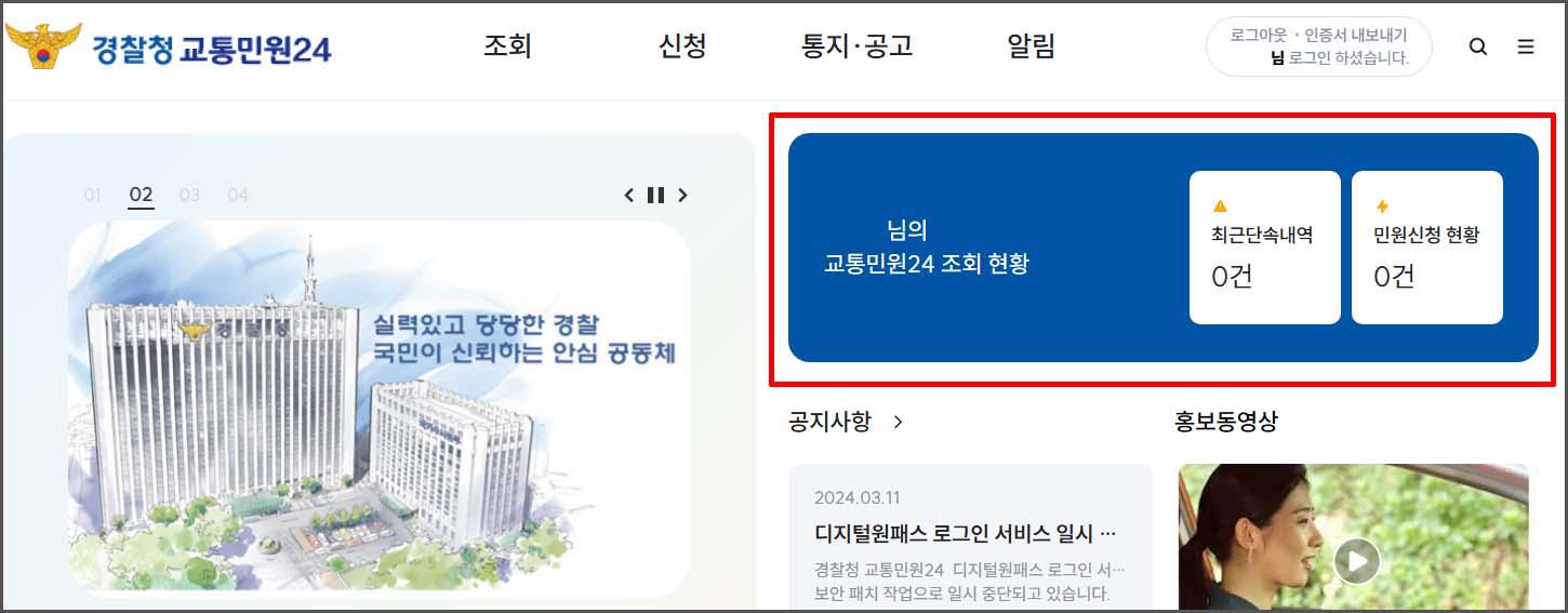 8. 인증이 완료되면 경찰청 교통민원 24 홈페이지 메인 오른쪽 상단에 최근 단속 내역과 민원 신청 현황이 표시됩니다.