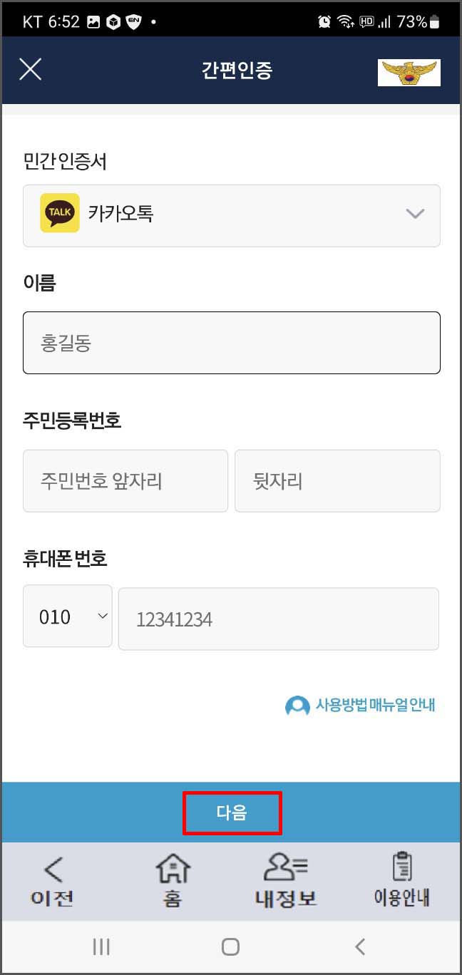 5. 이름, 주민등록번호, 휴대폰 번호 입력 후 다음 버튼을 눌러주세요.