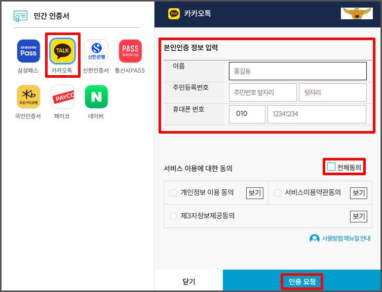 6. 민간 인증서 항목에서 카카오톡 선택, 본인인증 정보 입력, 전체동의 체크 후 인증요청 버튼을 클릭합니다.