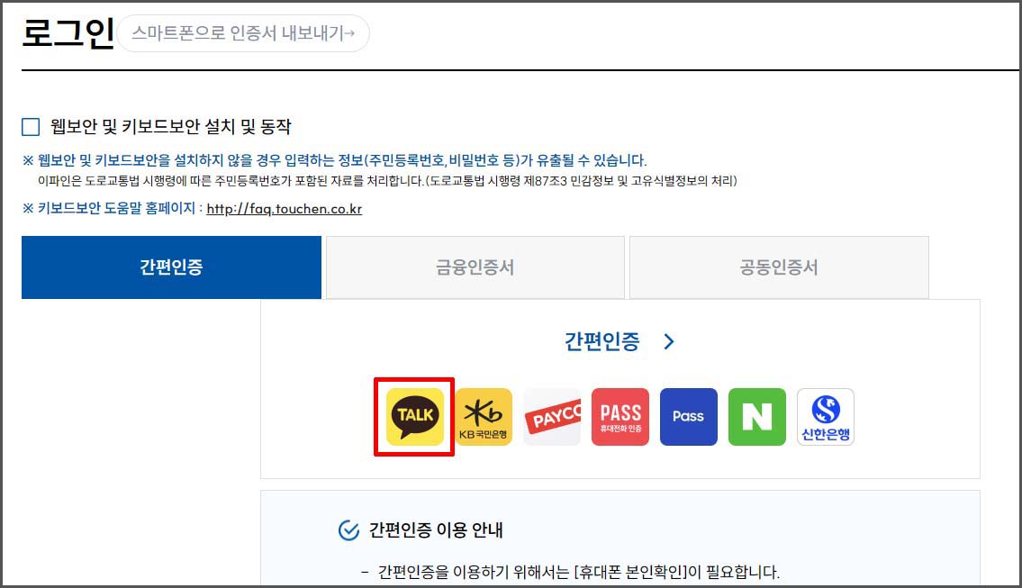 3. 로그인 화면에서 간편 인증, 금융인증서, 공동인증서 중 가장 편한 방법을 선택합니다. 저는 간편 인증 카카오톡으로 진행하겠습니다.