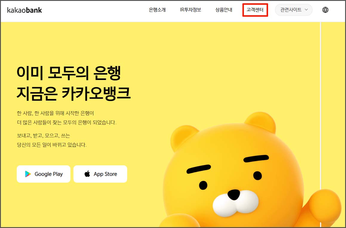 13. 카카오뱅크 홈페이지 오른쪽 상단에 고객센터를 선택합니다.