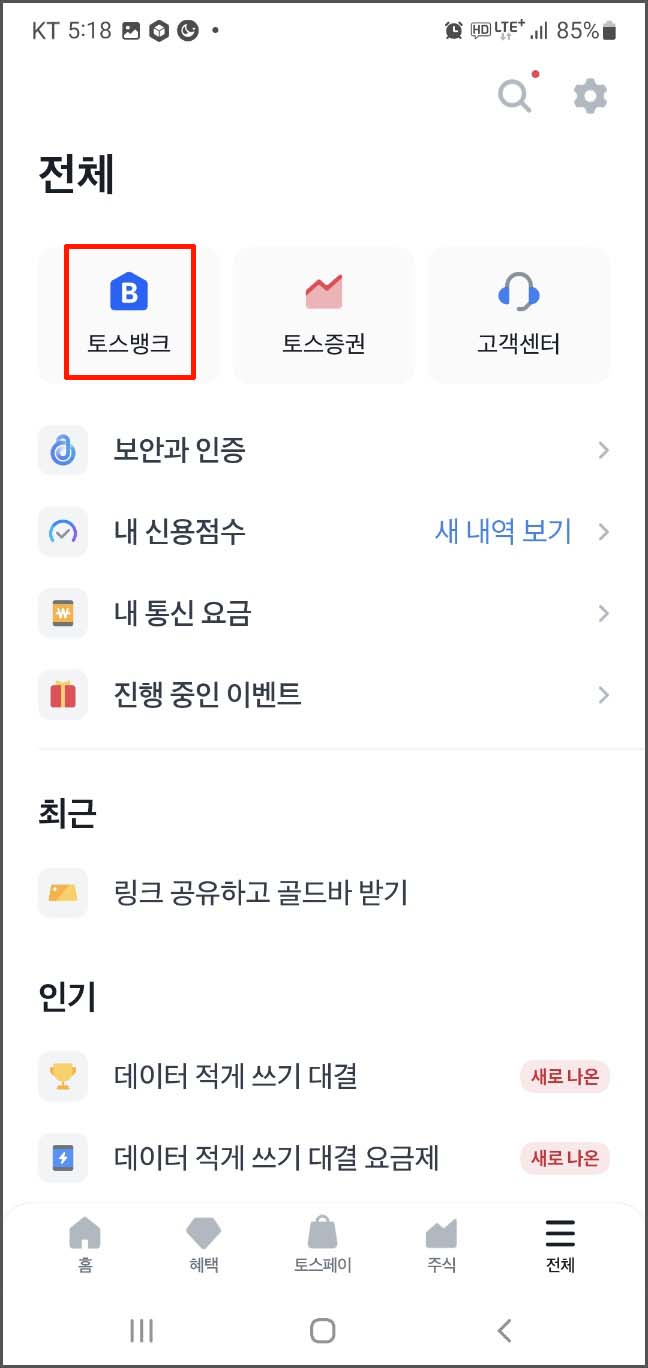 3. 왼쪽 상단에 토스뱅크를 선택해 주세요.