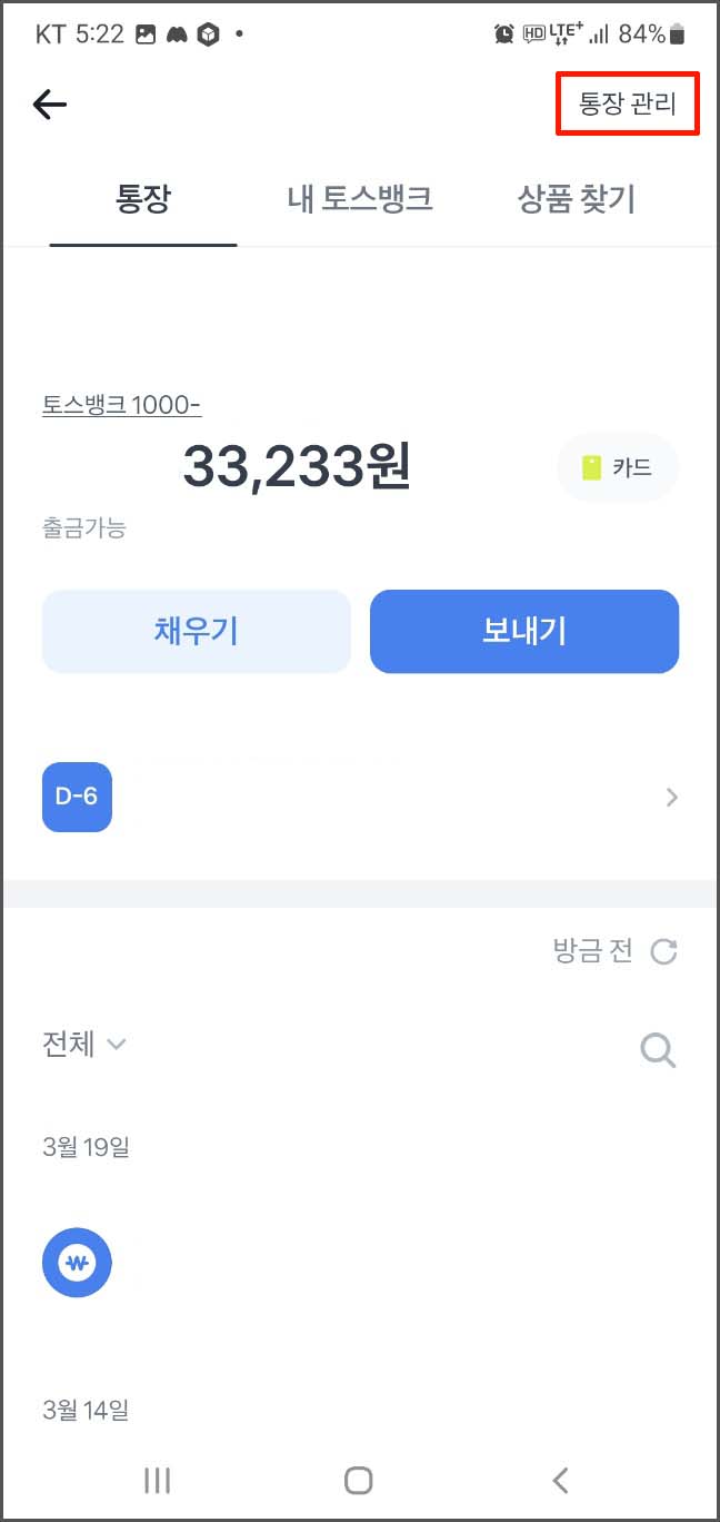 5. 오른쪽 상단에 통장 관리 메뉴를 선택합니다.