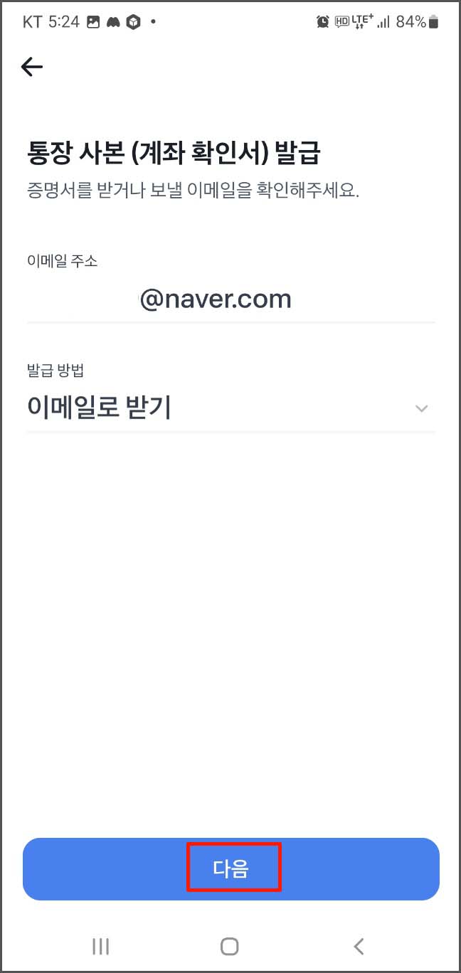 16. 계좌번호와 이메일 확인 후 발급받기를 선택해 주세요.