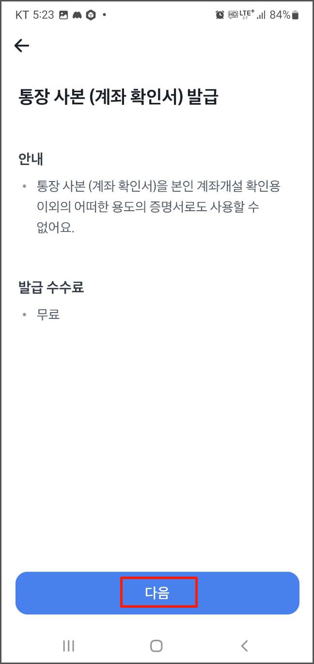 7. 통장사본(계좌확인서) 발급 및 수수료 안내창에서 다음 버튼을 클릭합니다.