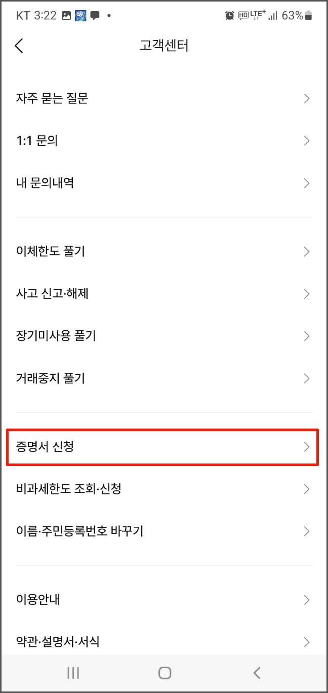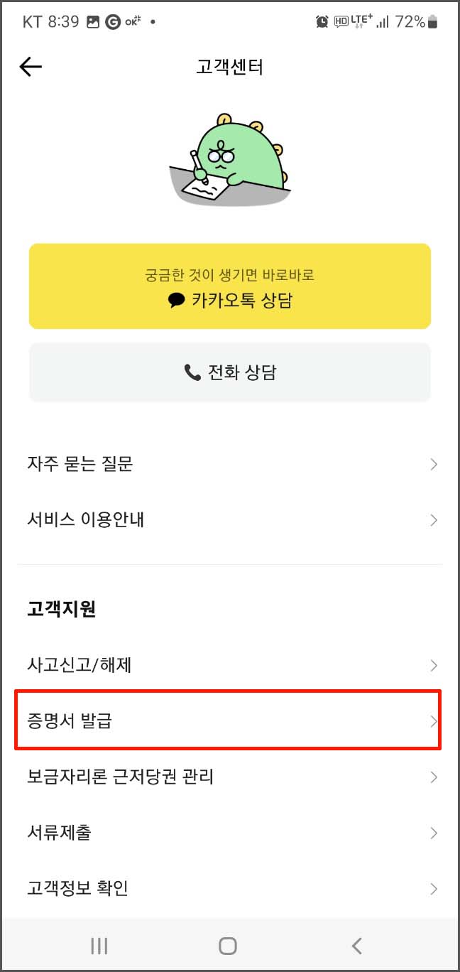 4. 고객지원 항목에서 증명서 발급을 선택합니다.