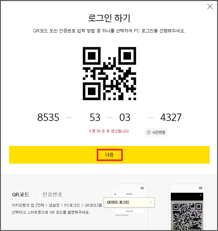22. 다시 PC 카카오뱅크 홈페이지로 돌아가 로그인하기 화면에서 다음을 클릭해 주세요.