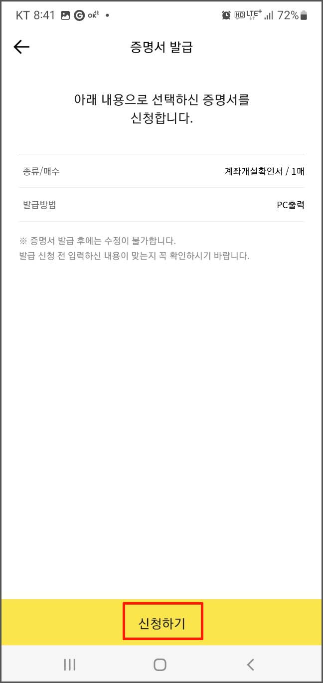 10. 증명서 발급 내용을 확인 후 신청하기 버튼을 클릭합니다.