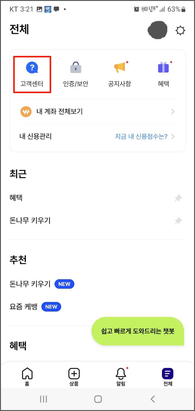 3. 왼쪽 상단 고객센터를 선택합니다.