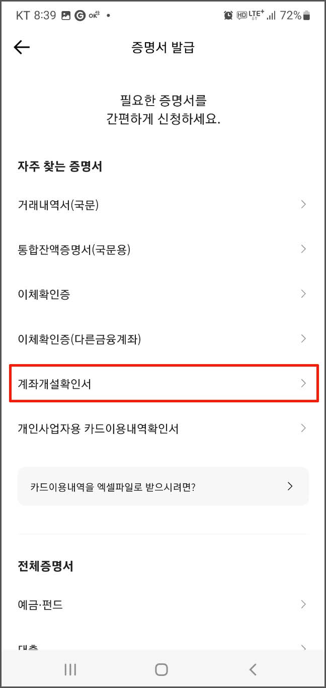 5. 자주 찾는 증명서 항목에서 계좌개설확인서를 선택해 주세요.