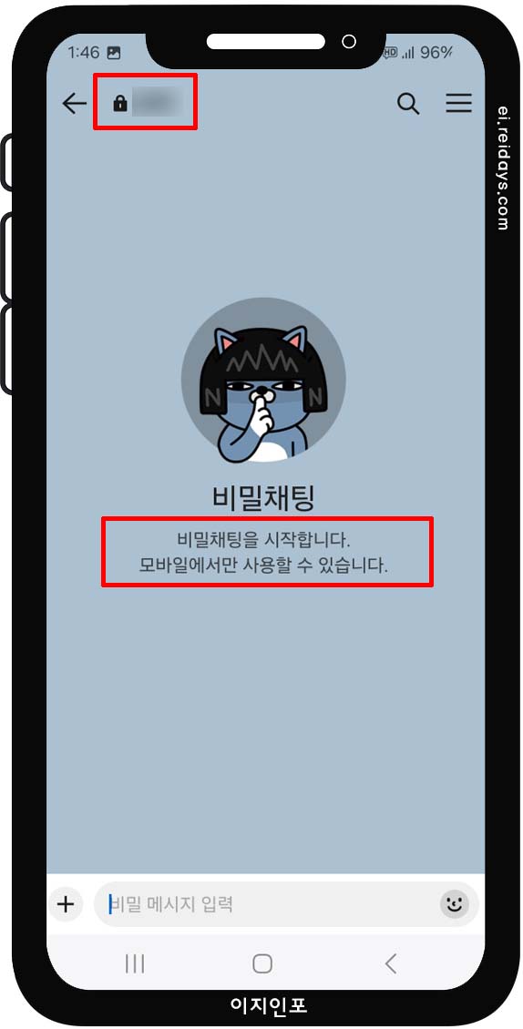 6. 새로운 채팅방이 열리면서 왼쪽 상단 친구 아이디 옆에 자물쇠 아이콘이 표시되고, "비밀채팅을 시작합니다. 모바일에서만 사용할 수 있습니다."라는 메시지가 뜹니다.