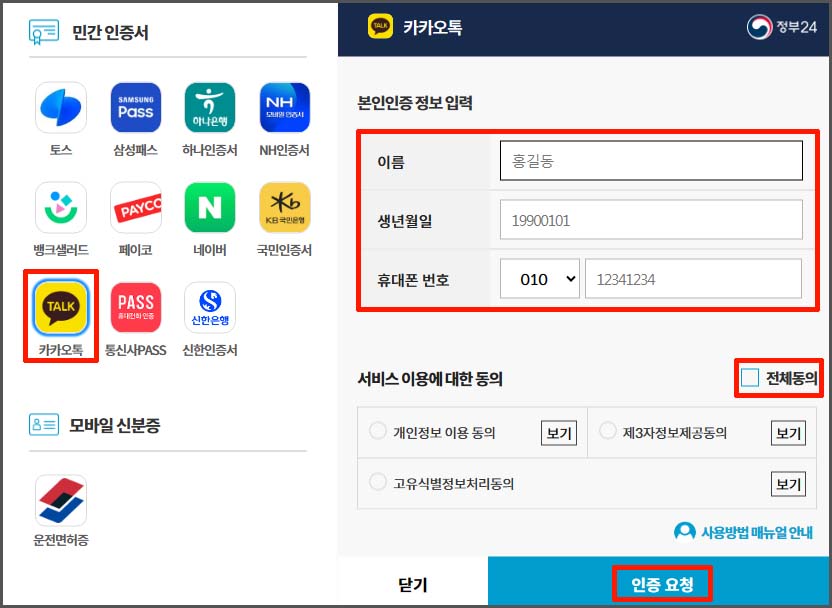 7. 간편 인증을 선택하면 다시 민간 인증서 선택 화면이 나옵니다. 이 중 가장 편한 방법을 선택하고 이름, 생년월일, 휴대폰 번호 입력 전체동의에 체크한 후 인증 요청 버튼을 클릭합니다.